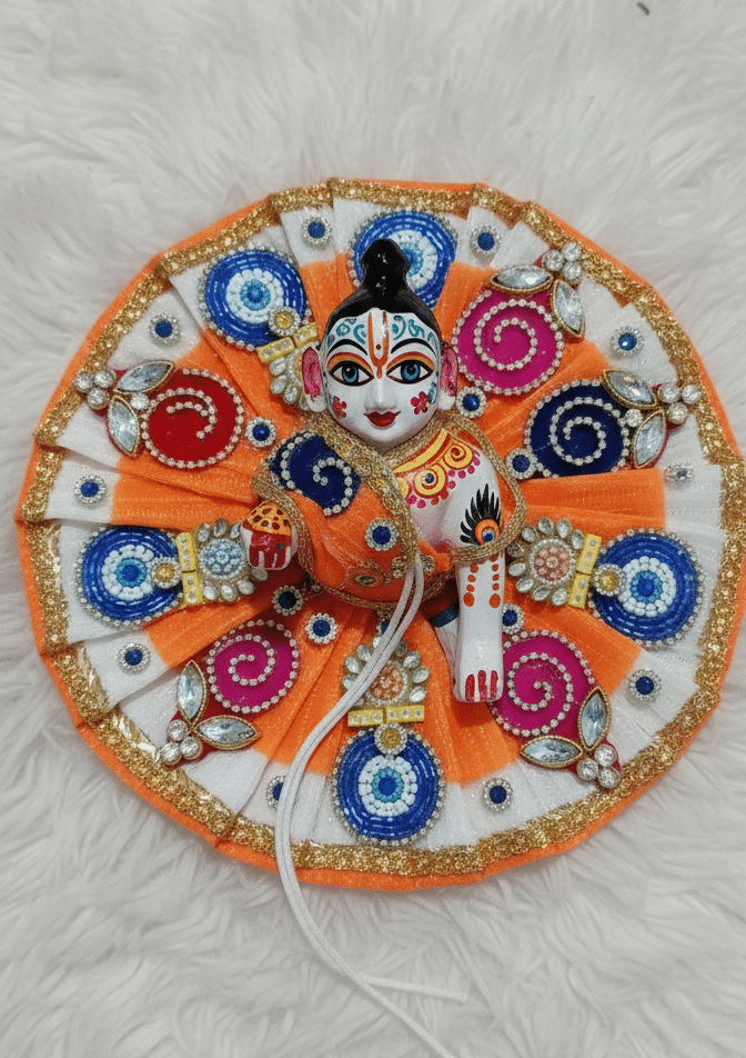 Designed for both daily shringar and special festivals like Janmashtami or Diwali, this outfit symbolizes joy, purity, and devotion. The vibrant orange and blue color combination adds a festive aura, making it perfect for temple décor or home worship.