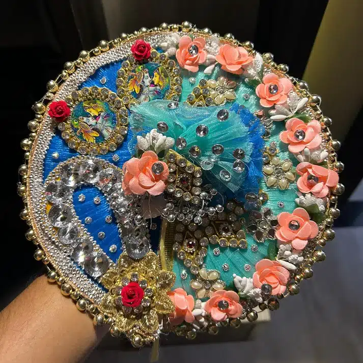 Enhance your divine altar with the Tulsi Floral Beaded Designer Laddu Gopal Dress, a stunning blend of tradition and modern artistry. This dress is crafted with shimmering blue and turquoise fabric, adorned with beautiful pastel-orange flowers, pearls, silver beads, and printed Krishna Leela motifs that bring life to your pooja space.